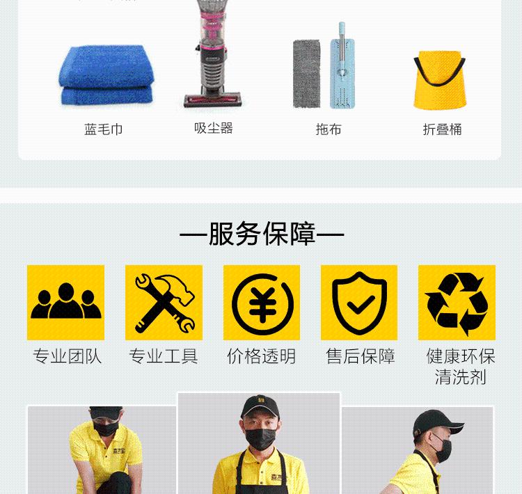 公司注重服务与专业,定价是以结果为导向,省心一口价,不现场加价,工具齐全,干活认真,客户确认满意后再离开; 全屋深度清洁及高温消毒,适用于搬家后或长时间未彻底打扫的住宅。 计费标准: 1、夜间18点以后上门服务,每人每小时加15元。 2、单位计算:一人/小时,如果两人共同打扫一小时,是按2小时收费; 3、超时计费:服务超预定时间后,按60元\小时\人补差价,不足半小时按半小时算,超过半小时不足一小时按一小时算; 服务人数: 服务时长在6小时以下的,将由1名服务人员提供服务;6小时及以上的将由2名服务人员进行服务,每人服务一半时长。 携带工具: 分区毛巾、多功能刷子、百洁布、清洁剂、高温蒸气机或吸尘器。 注:因专业设备携带不便,故服务时长<6小时的,服务人员默认携带高温蒸气机上门,如需替换成吸尘器的,只需在备注中注明即可;服务时长≥6小时的,服务人员将同时携带高温蒸气机和吸尘器上门。 参考时长: 一居1厨1卫(70㎡内)、二居1厨1卫(100㎡内)建议订购4小时服务;二居1厨2卫(120㎡内)、三居1厨1卫(130㎡内)建议订购5小时服务;三居1厨2卫(160㎡内)建议订购6小时服务;四居1厨2卫(200㎡内)建议订购7小时服务。下单时请选择对应户型,如户型超出额定面积或房屋洁净程度较低需增加服务时长的,请与服务人员协商。 服务范围: 1.客餐厅、电视柜、茶几、门、桌面、垃圾桶、地面和其他; 2.卧室和衣帽间、阳台扶手栏、开关、窗槽、窗台和其他; 3.书房和储物间、窗台、桌面、书柜、垃圾桶、地面和其他; 4.厨房、抽油烟机表面、橱柜、洗菜池、台面、垃圾桶、地面和其他; 5.卫生间、洗漱台、沐浴房、马桶、垃圾桶、地面和其他; 6.阳台和露天、阳台、扶手栏、开关、窗槽、窗台其他无杂物、无污渍。 服务说明: 1.家电内部清洁不在服务范围内; 2.室外玻璃以及纱窗、百叶窗、防护窗清洁不在服务范围内; 3.窗帘、古董字画、宗教陈设、花草绿植、宠物、天花板、灯具清洁不在服务范围内; 4.为保护您的隐私,家具橱柜内部不在服务范围内。 服务保障: 1.清洁内容丰富,专注卫生死角 2.保证服务质量,如果服务人员做的不到位请您一定要及时联系我们,我们会坚决严肃处理,保证直到服务您满意为止 3.拒绝乱收费,明码标价严格按照行业标准